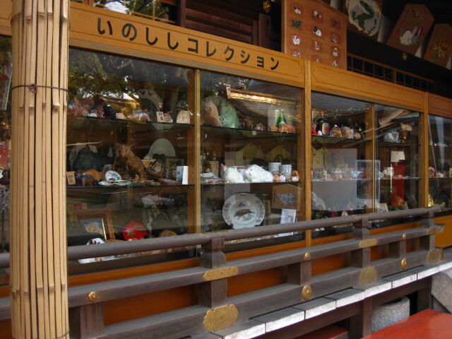 境内の南側一角にはいのししのコレクションが、神秘的なものからかわいいものまでたくさんある。