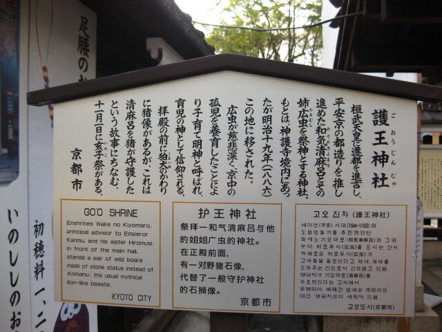 かつて神護寺に和気清麻呂の霊社として祀られていた護王神社、今は京都御所の西側、蛤御門(長州藩と会津桑名藩との激戦の場所)の向かいにある。