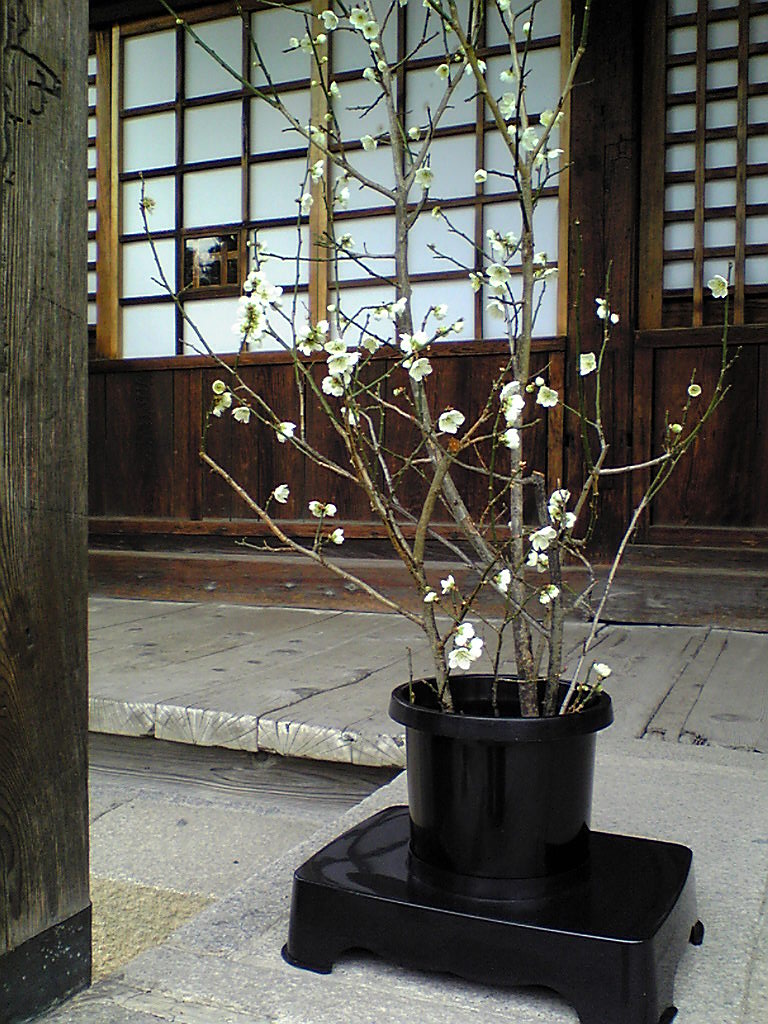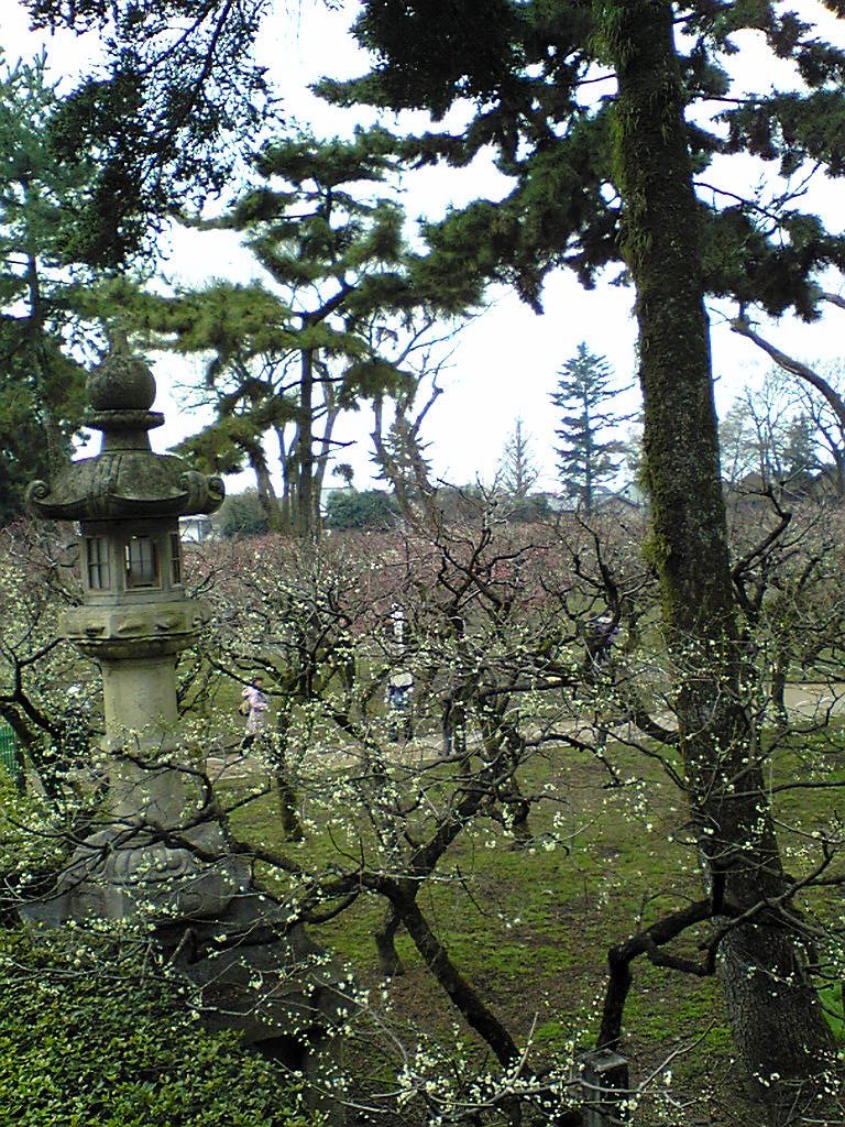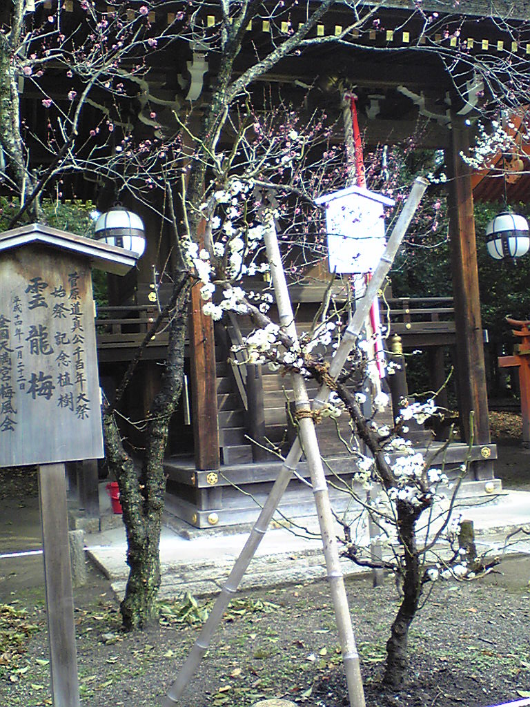 駐車場は一番乗り。歴史のパワーを感じる場所の朝はなんとも清涼、梅苑の梅は五分咲きといったところだ
