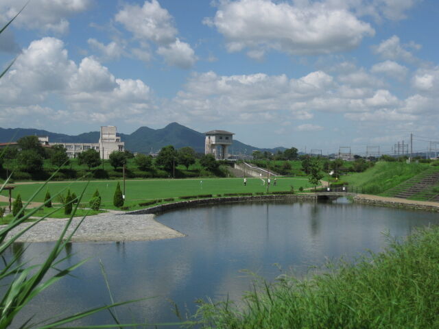 堤防から目線はグラウンド・ゴルフの芝生公園、そして遠くに二上山。