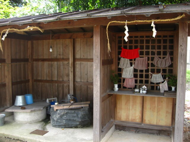 同じ覆い屋に守られたお地蔵様の格子に前掛けが干されていた。何かホッとさせるものがある。裏返されたバケツも日常の手入れを感じる。