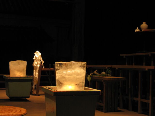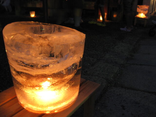 氷室神社の四脚門前、氷で造られた燈篭にロウソクの炎が揺らめく