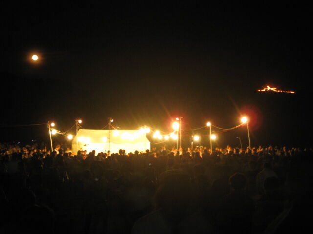 会場は人、人、人でまるで野外ライブの様相。左にお月様、右手に大文字送り火。