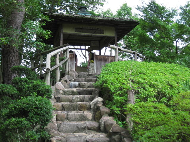 離れ茶室へと石段をひつずつ登る。