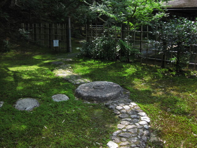 苔の庭を下り、石燈篭の脇から茶室を振り返る。