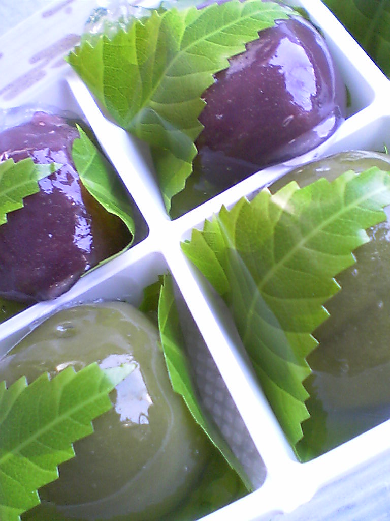 甘さ控えめな上品な味で、色彩もとても美しい。緑のは「抹茶くずまんじゅう」真夏によくひやしていただく。