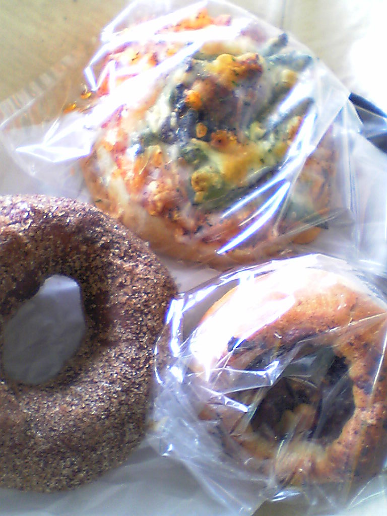 手前左より時計回りで「赤ワイン入りうずら豆のドーナツ/157円」「野菜たっぷりのピザ/136円」「アポロあんぱん/126円」あんぱん!自家製の粒あんが◎