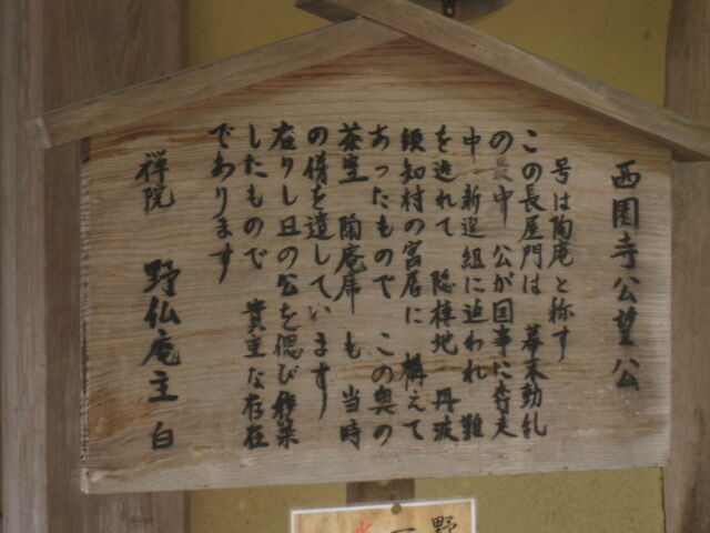 2つ上の写真の茅葺の長屋門は、明治~昭和初期の総理大臣・元老として知られる西園寺公望が、幕末に新撰組に追われ一時丹波須知(京都府丹波町)に身を隠していた際の寓居の門をここに移したもの。