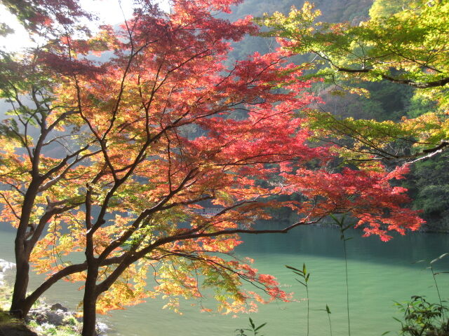 写真↑は亀山公園の展望台、保津川下りの乗り場からスタートして間もない、星野リゾートの旅館あたりを見下ろせる場所、また対岸の山の中腹にはお堂も見える。