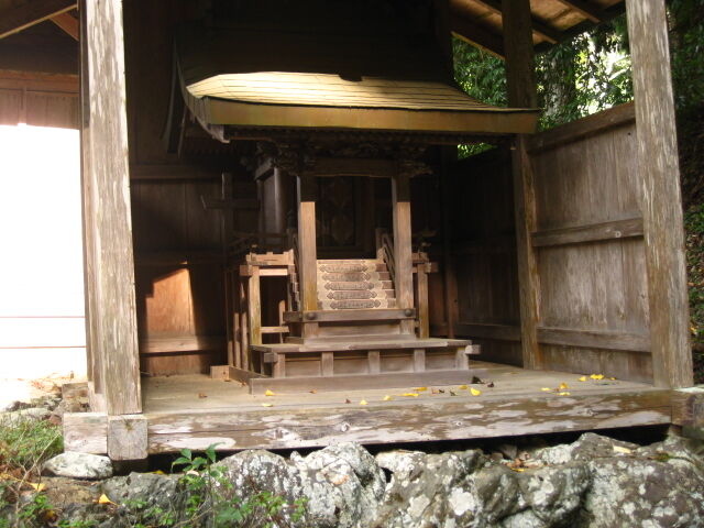 本殿裏に覆いかぶさるように磐座があり、その脇に祀られている。