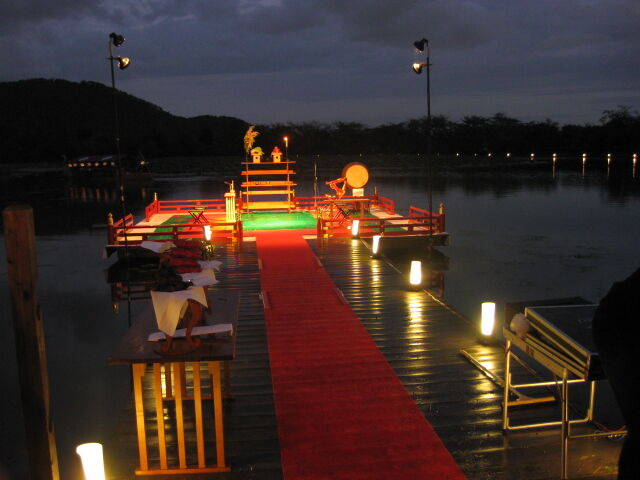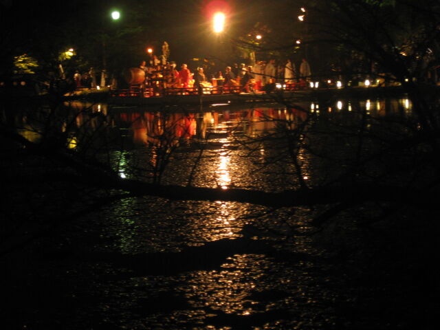 上の写真が鷁首舟/げきしゅ-、下が龍頭舟といって池を一周(約15~20分)しながらお抹茶を喫して水面に浮かぶ月を愉しむというもの。