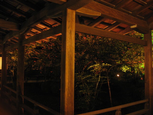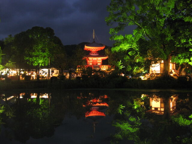 中央は朱塗りの心経宝塔、左手の灯りは京の老舗、有名店による夜店。そして右手の灯りは護摩堂。