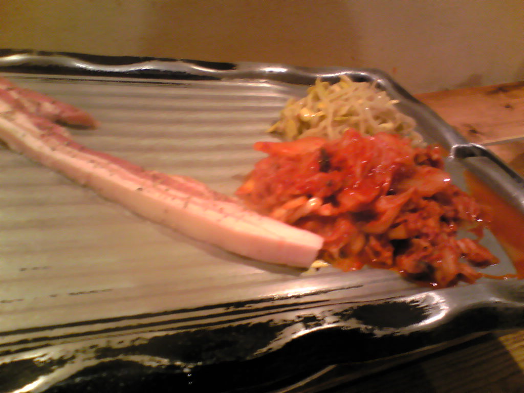 斜めの鉄板で焼いた豚肉、キムチ、もやしをサンチュで味噌、ネギなどとを包んで食べるアレ。