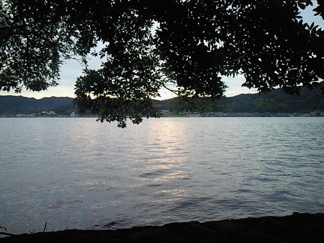 ちょうど中間のところから阿蘇の海を見る。木々の葉たちと夕暮れ。