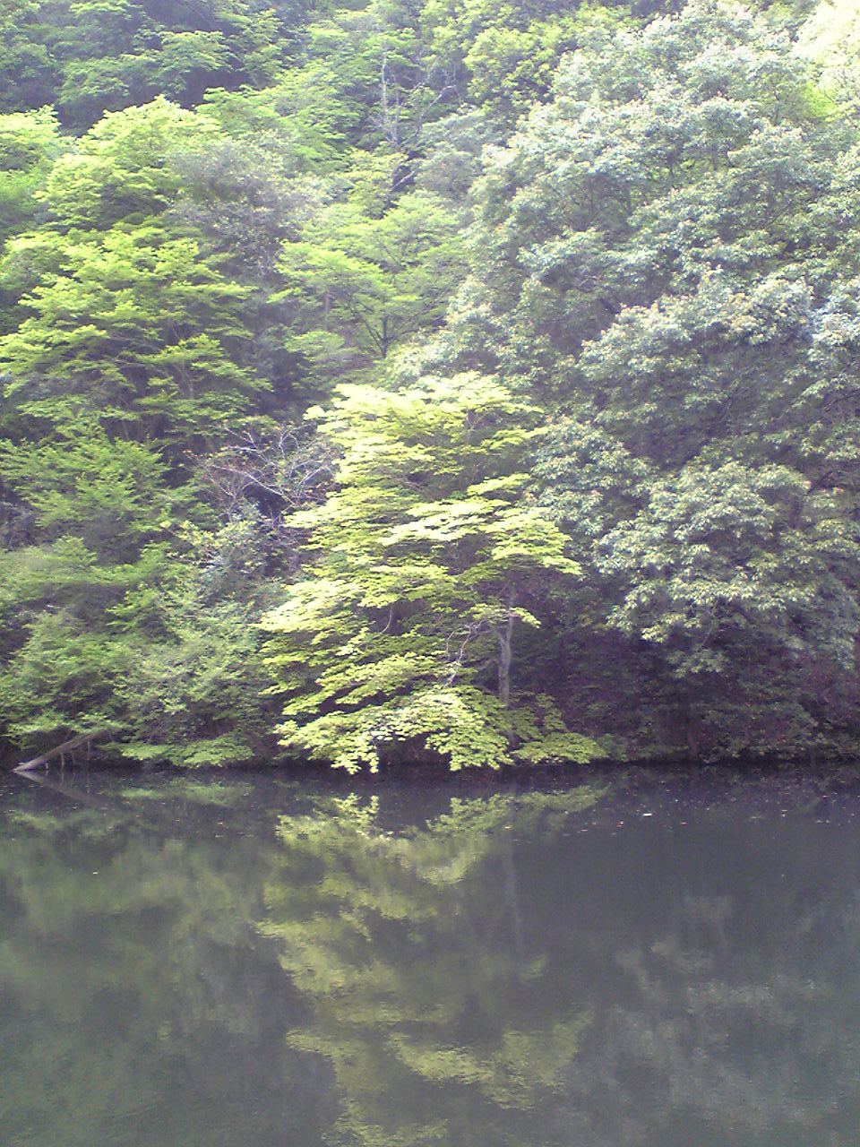 展望台より群落を見る。山の地すべりで谷にずり落ちる木々もあり、不安な様相を見せている。やや終りかけとはいえ美しい眺めだった。