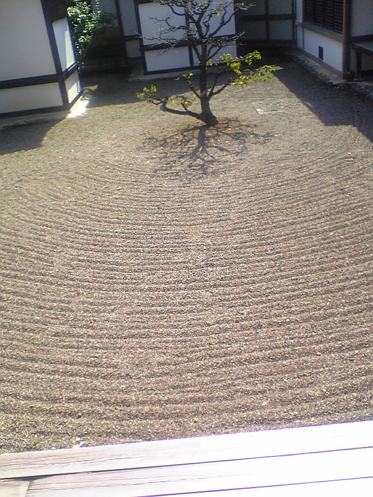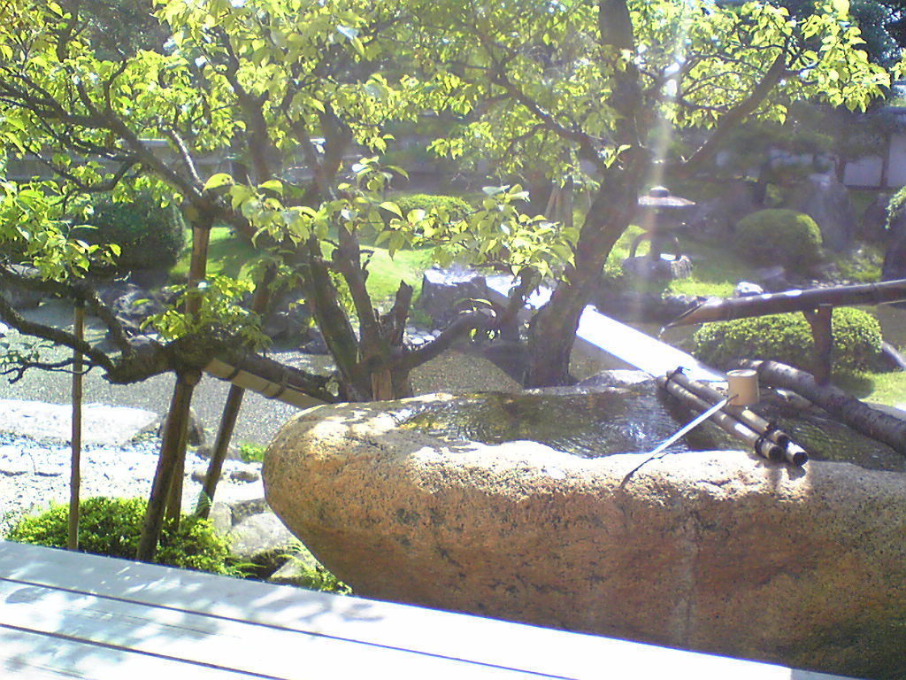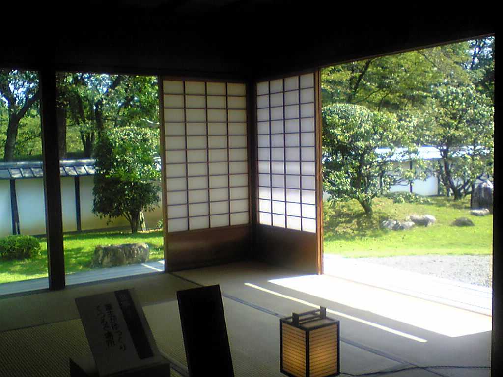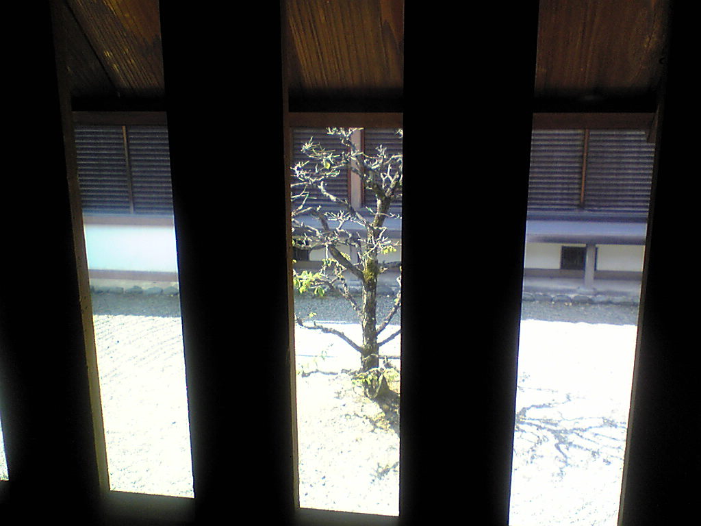 格子窓から見る庭園の古木