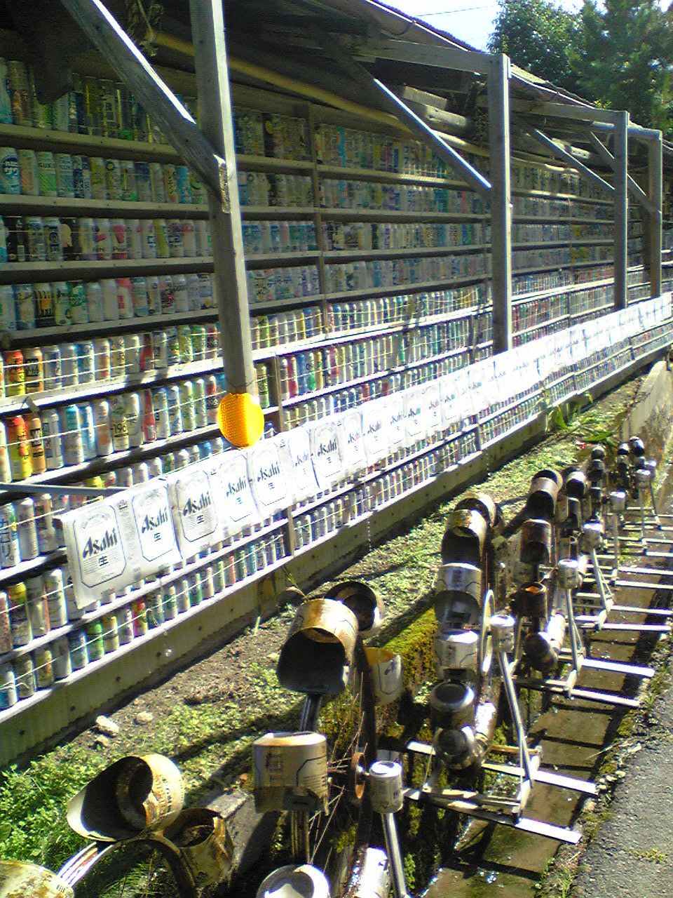 走り出してすぐに、おもしろい家を見つけた。ジュースやビールなどの空き缶をコレクションしている。それも国道沿いに...きれいな水が流れる溝には缶で作られた水車があった。すげーっ