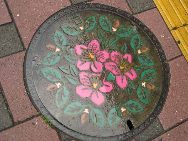 玉野市の花「つつじ」をあしらったカラーのマンホール。
