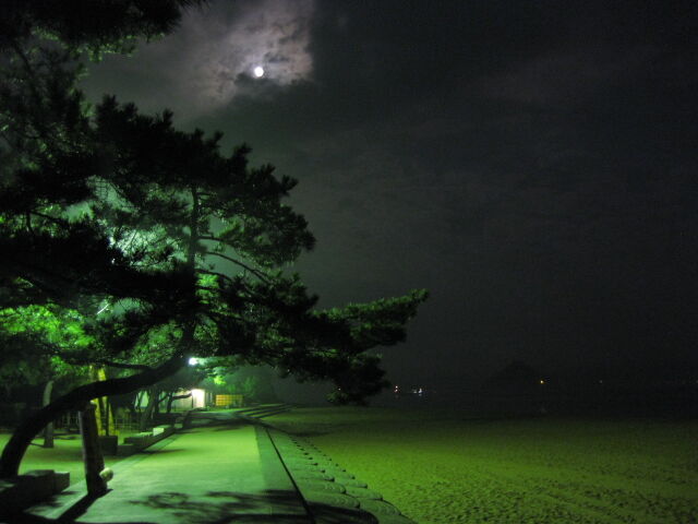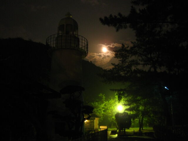 この日はほぼ満月。遠くの街灯と灯台と月 きれいだった