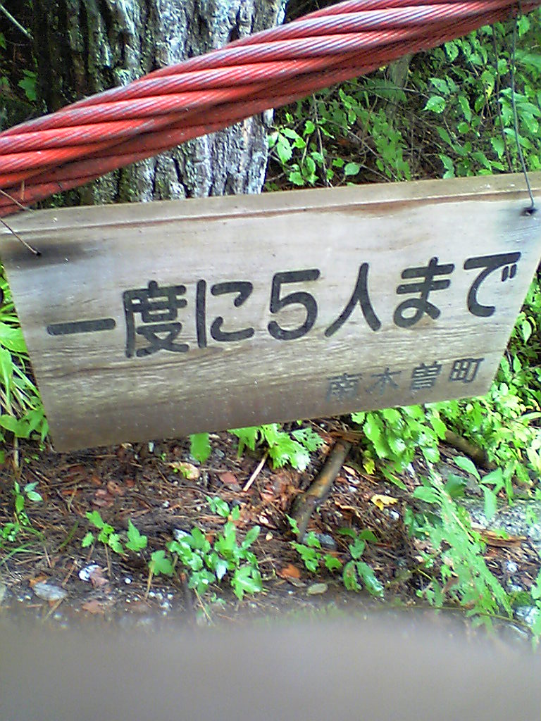 車をとめて、林道を抜けて、一度に5人までと書かれたつり橋を渡る。