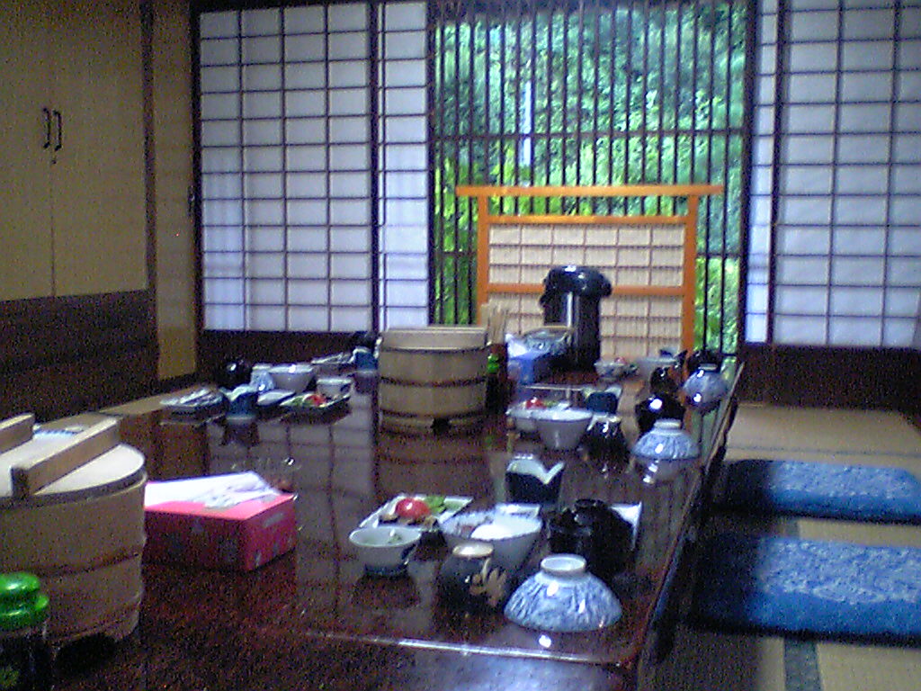 て、その奥が↑の写真のように宿泊客が集まって食事をする広間。(写真は朝食の用意ができている風景)