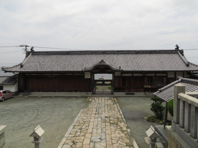 境内から見た実に立派な神門と美しい石畳、その先は28号線を挟んで瀬戸内海。