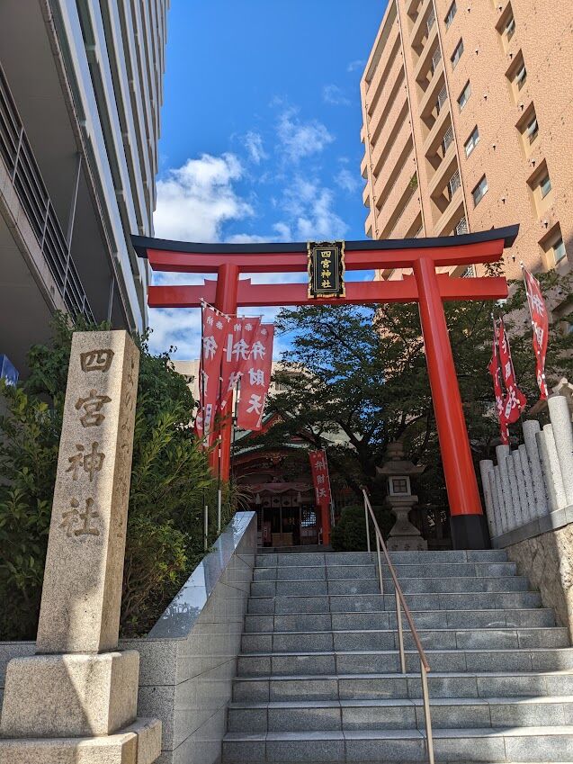 生田裔神八社の中の四柱目、四宮神社は兵庫県庁の北側にある。ビルとビルの隙間に赤い鳥居と弁財天ののぼりがはためいている。