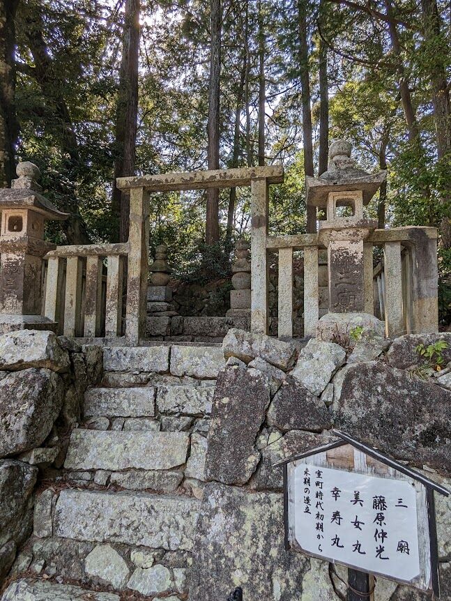 幸寿丸を中心に右に美女丸、左に幸寿丸の父藤原仲光の墓