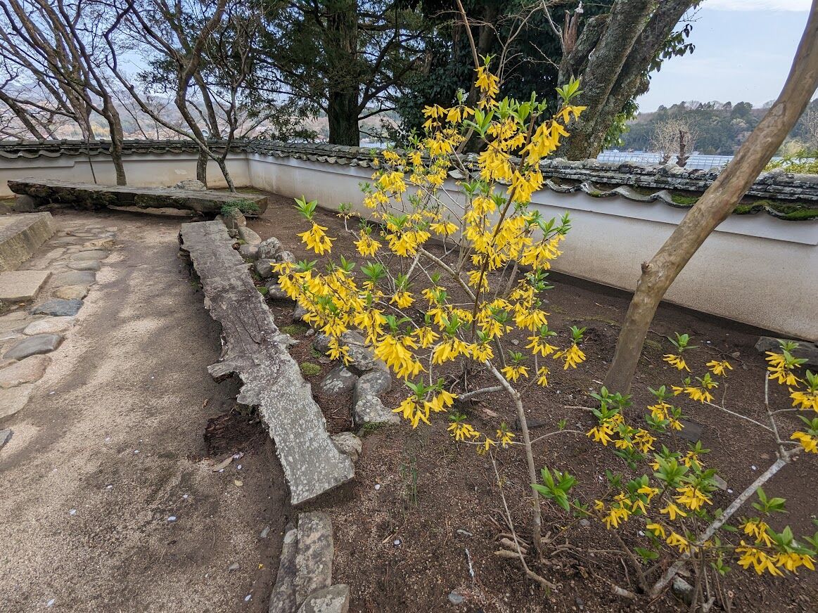 白い壁にシナレンギョウの鮮やかな黄色がよく映える。木をそのまま使ったベンチも素敵だ。
