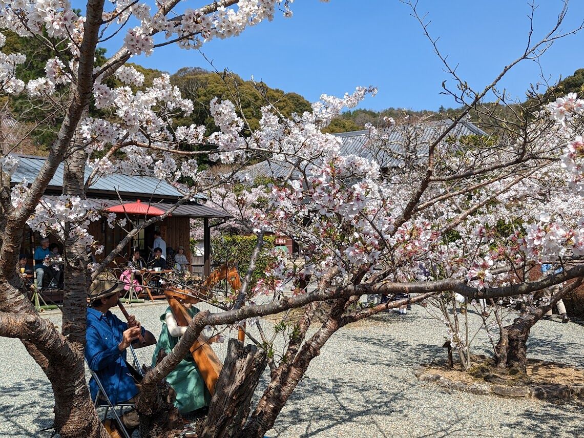 参道の途中左手に広がる癒しの空間、飲食も楽しめて、この日はライブが催されていた。桜はどれもまだ若いが50年後は素敵な空間になっているだろう。