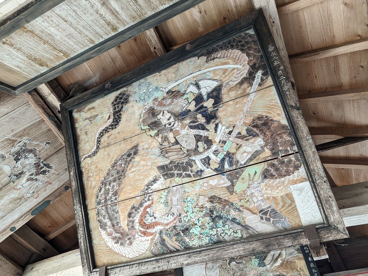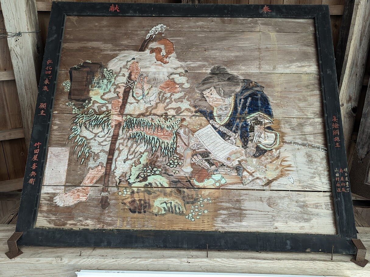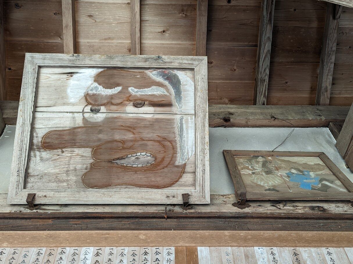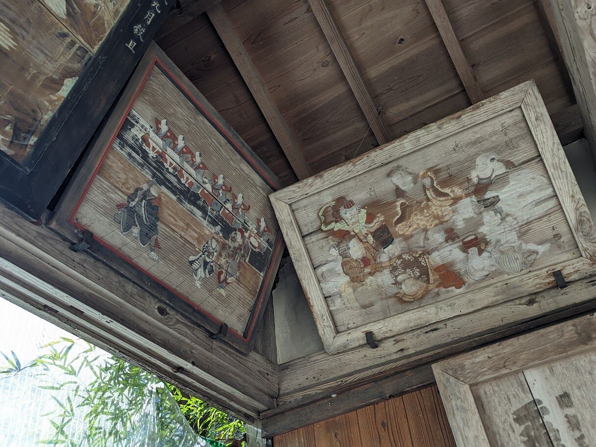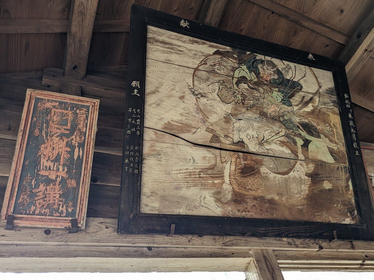 拝殿&本殿の西側、たくさんの絵や社史を物語る額がたっぷり。これがそれぞれの神社の個性をよく表す場所、いろいろと想像しながらじっくりと見るのがいい。