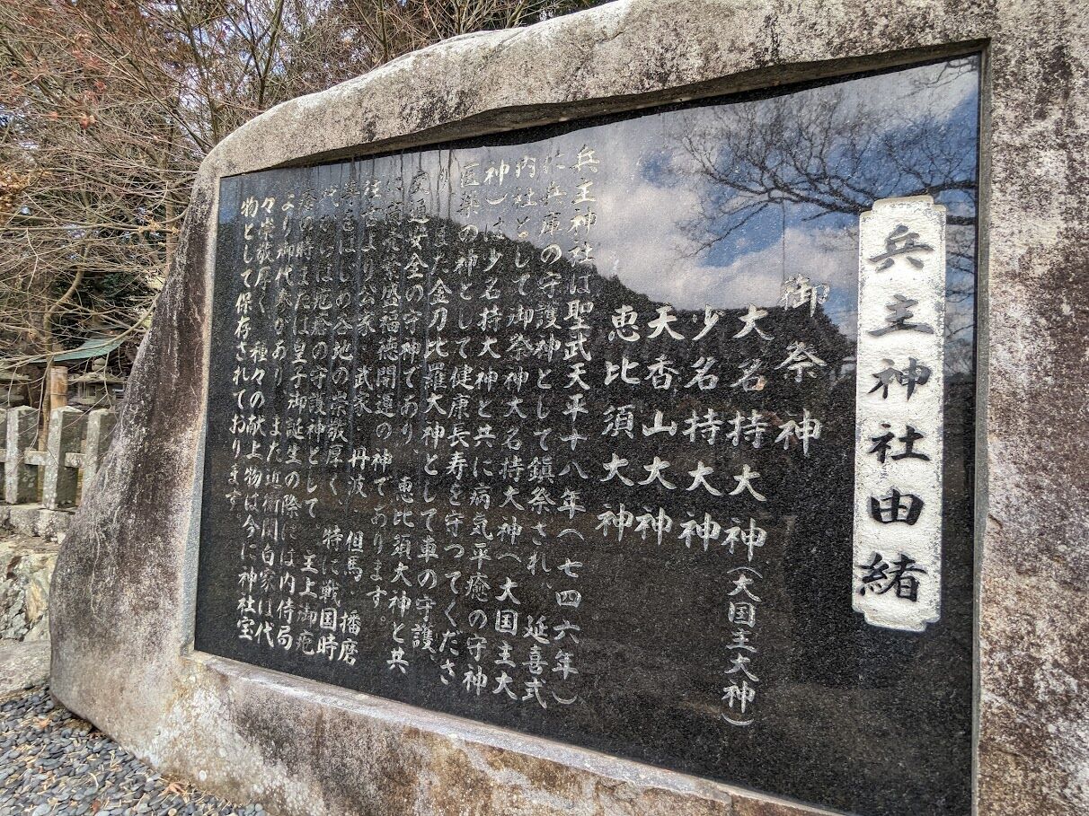 兵主神社/ひょうずじんじゃ、は日本に19社ある兵庫/つわものぐらの鎮守、奈良時代、天平18年/746年の創建。疱瘡の守護神として広く知られる。